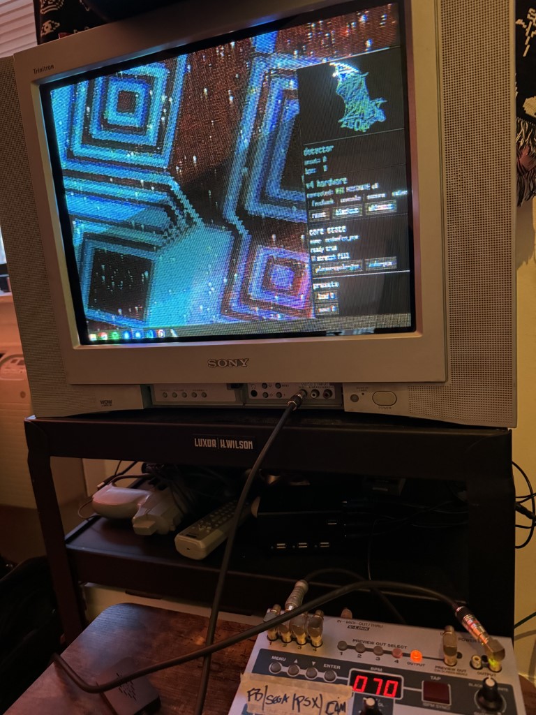 Built to orchestrate an Edirol V4 via MIDI, PSX and Genesis to a low latency video capture setup to streamline live performances.