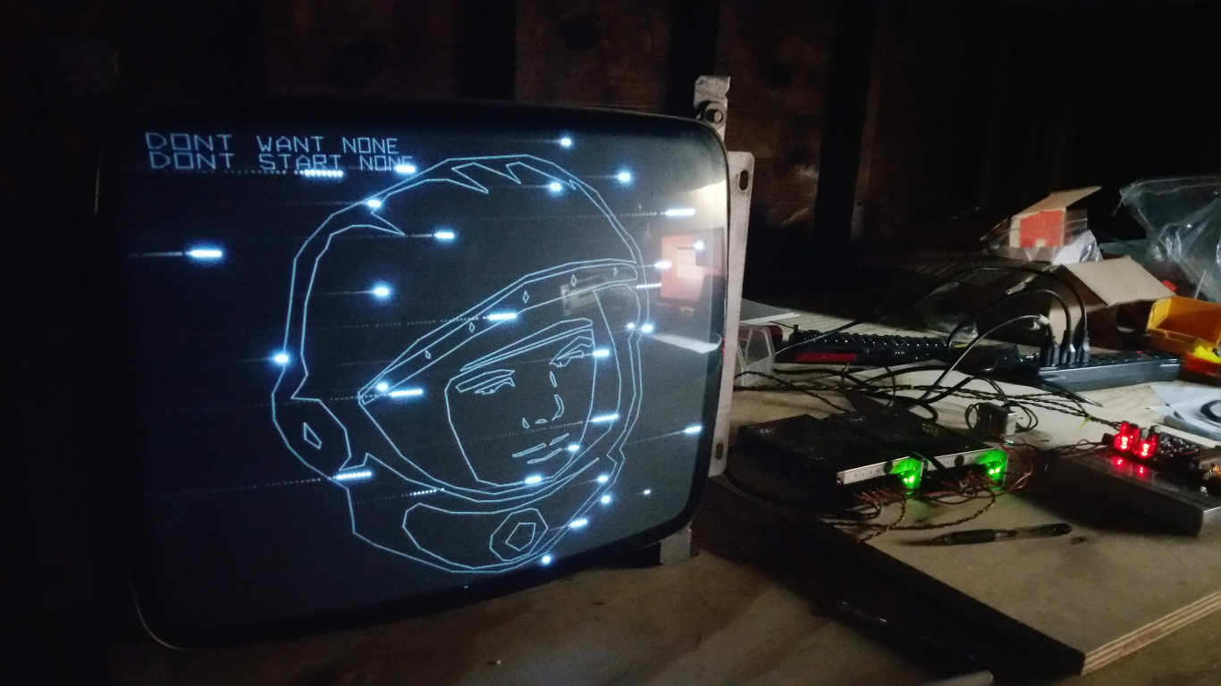 It started with an XY Monitor off Craigslist and ended with a custom designed, FPGA based vector video card, a gunner's control from an M1 tank, a separate monochrome HUD, an air raid siren, and a fully functional ruble acceptor. I designed the FPGA vector drawing system (VHDL) and HUD (python/SDL), Todd made the analog vector amp and cabinet, and Dooley made the game engine. A story about nuclear hysteria in the Cold War with a killer soundtrack from Nicholas "Windbreaker" Read.